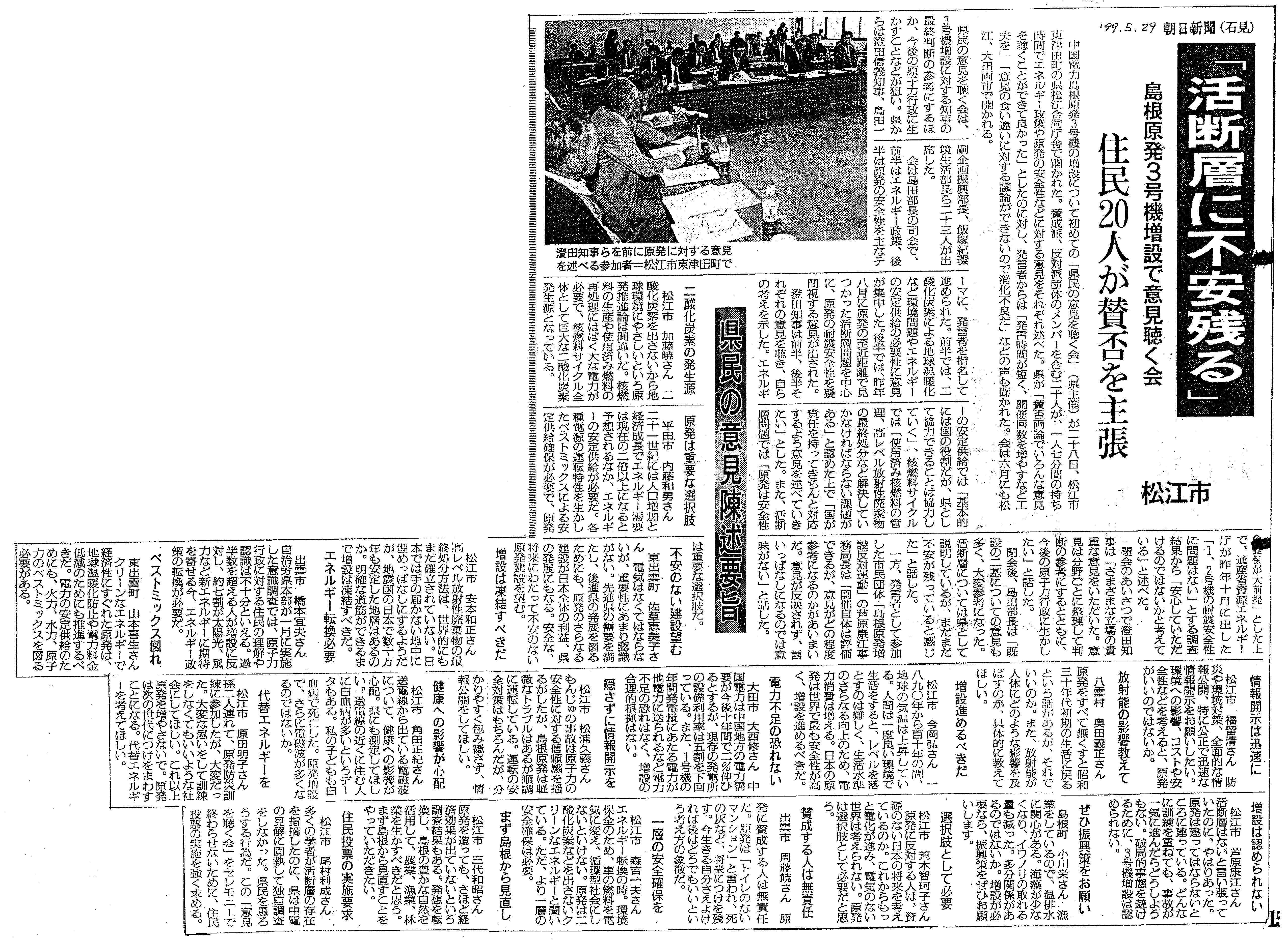 [1999_05_29_01]「活断層に不安残る」 島根原発3号機造設で意見を聴く会 住民20人が賛否を主張 松江市 県民の意見陳述要旨(朝日新聞1999年5月29日)