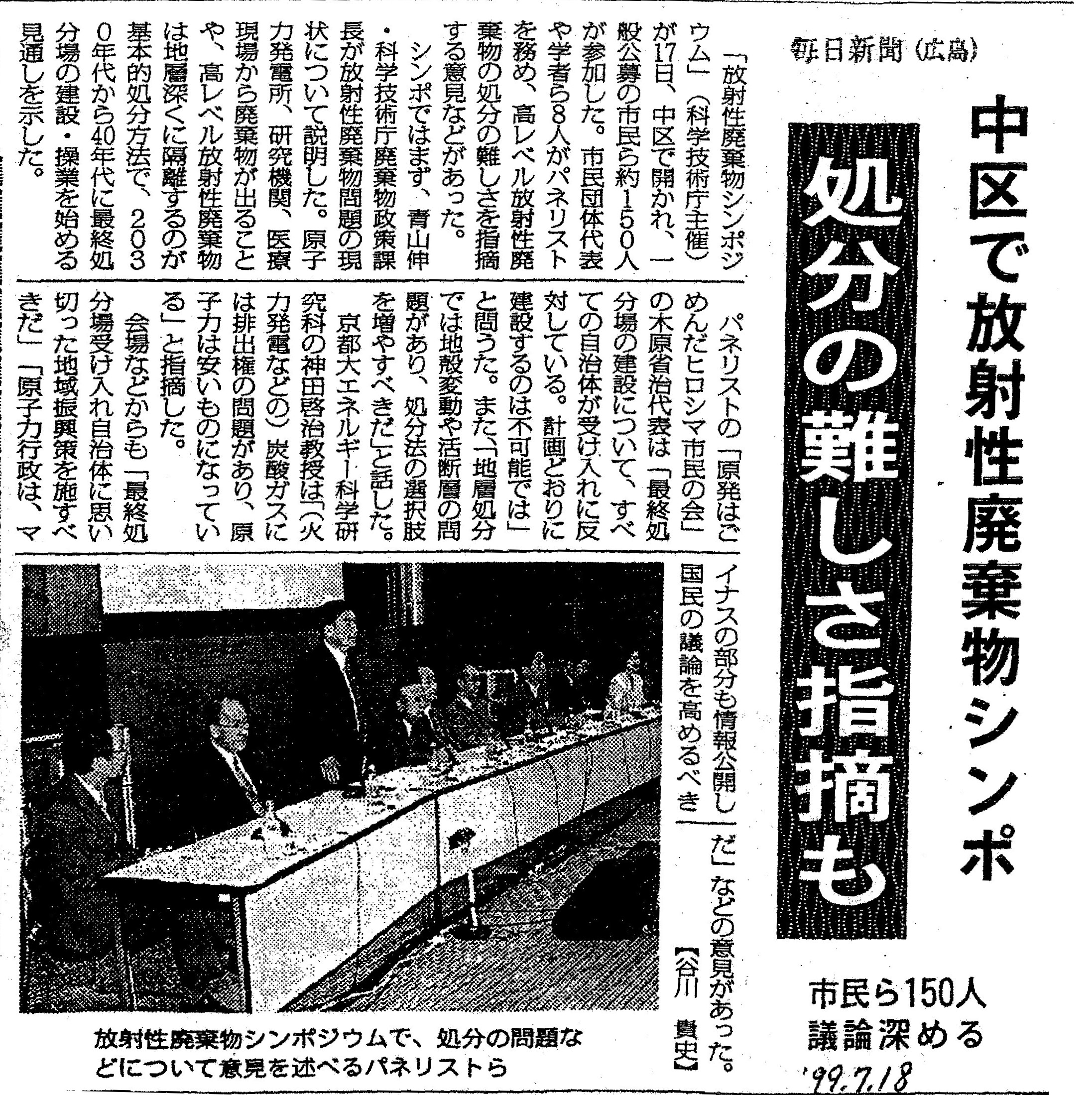 [1999_07_18_01]中区で放射性廃棄物シンポ 処分の難しさ指摘も 市民ら150人議論深める(毎日新聞1999年7月18日)