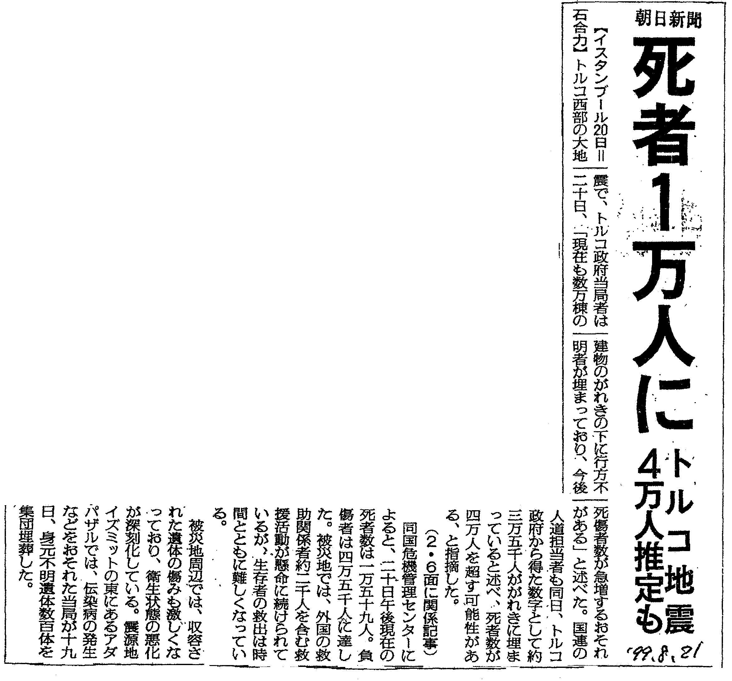 | [1999_08_21_02]死者1万人に トルコ地震4万人推定も(朝日新聞1999年8月21日) |