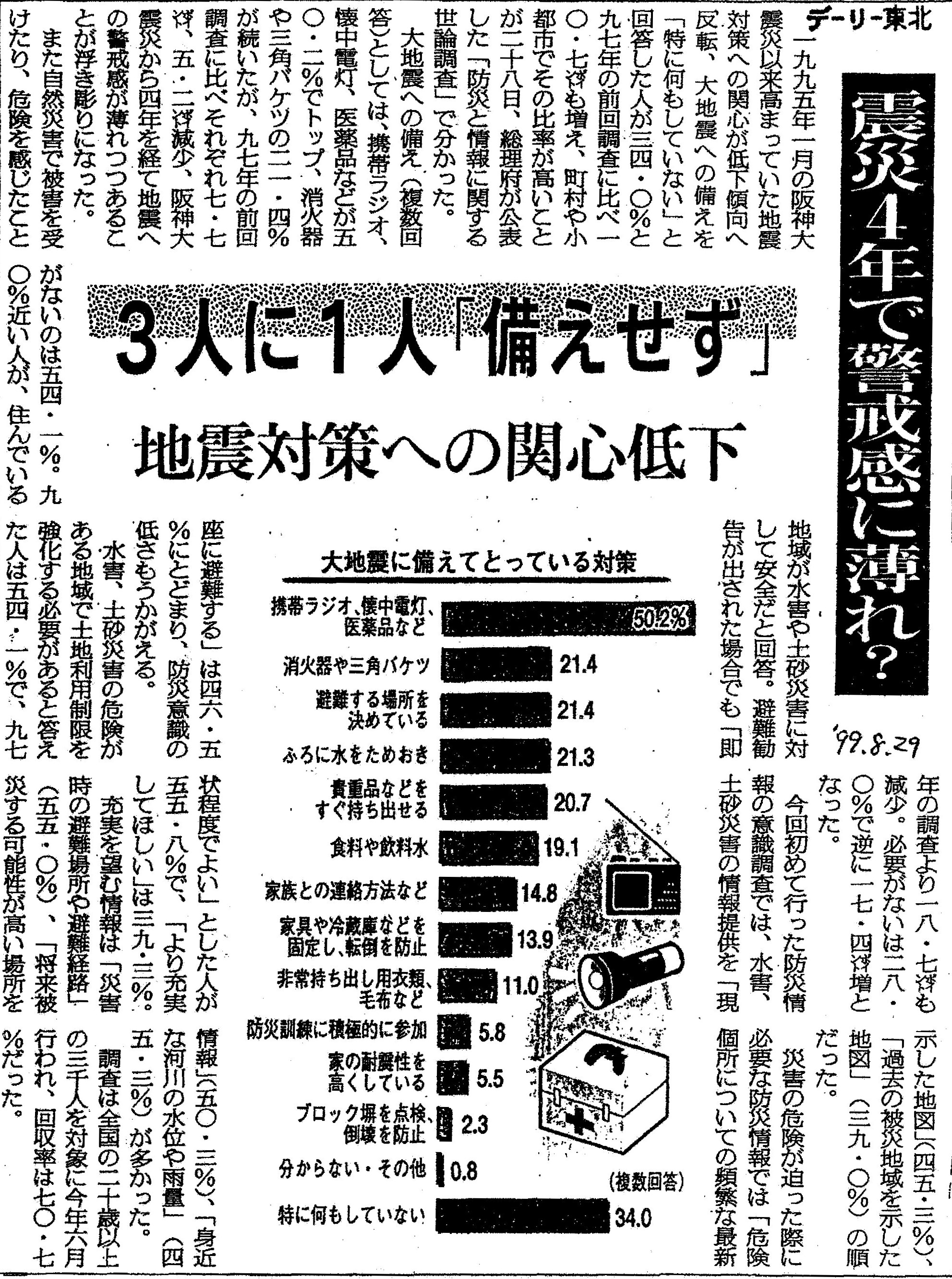 [1999_08_29_01]震災4年で警戒感に薄れ? 3人に1人「備えせず」 地震対策への関心低下(デーリー東北1999年8月29日)