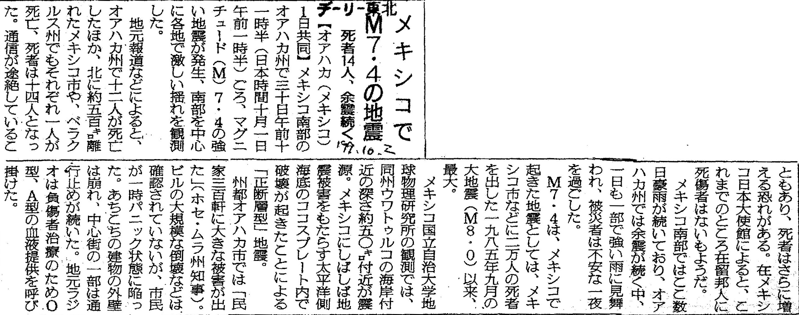 [1999_10_02_01]メキシコでM7.4の地震 死者14人、余震続く(デーリー東北1999年10月2日)