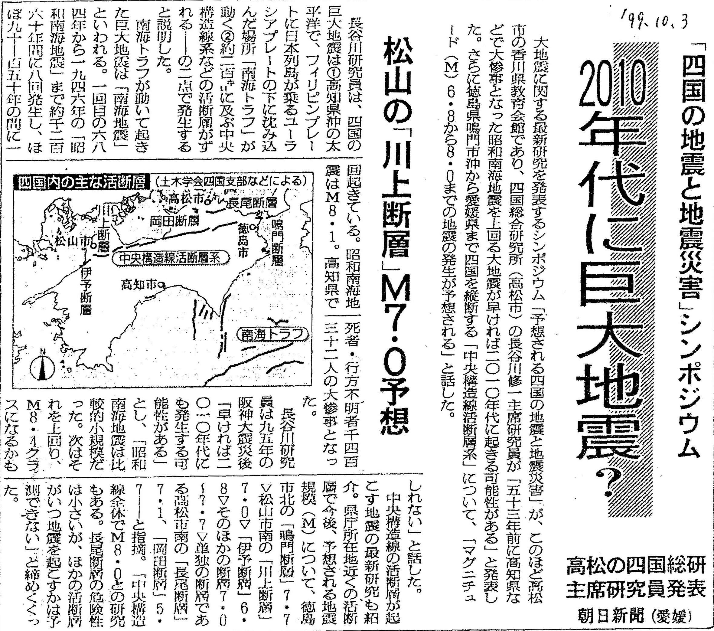 [1999_10_03_01]「四国の地震と地震災害」シンポジウム 2010年代に巨大地震? 高松の四国総研主席研究員発表 松川の「川上断層」M7.0予想(朝日新聞1999年10月3日)