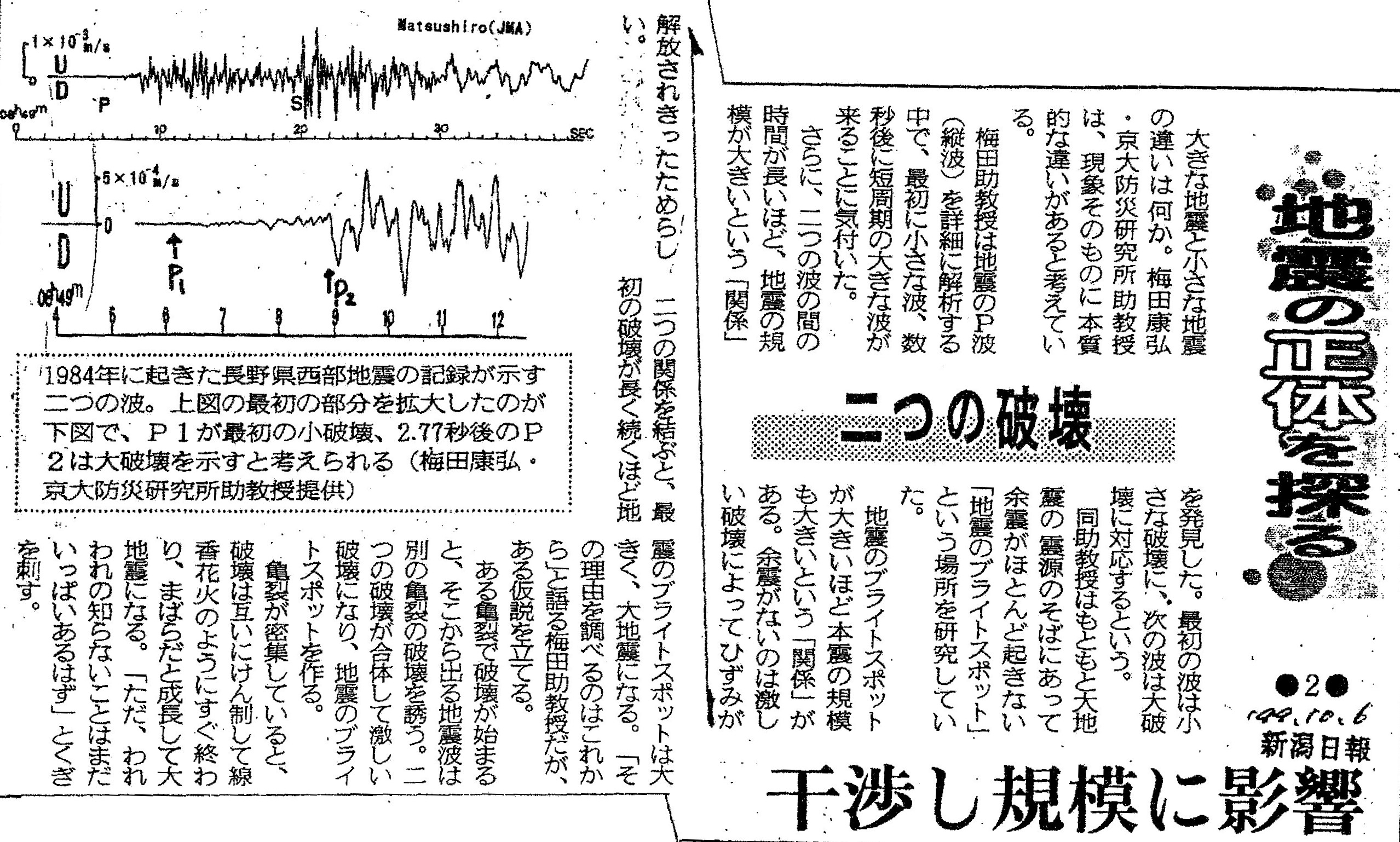 [1999_10_06_01]地震の正体を探る 二つの破壊 干渉し規模に影響(新潟日報1999年10月6日)