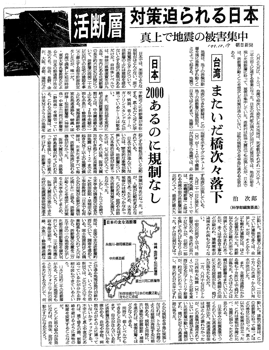 | [1999_10_17_01]活断層 対策迫られる日本 真上で地震の被害集中 台湾 またいだ橋次々落下 日本 2000あるのに規制なし 泊次郎(科学部編集委員)(朝日新聞1999年10月17日) |