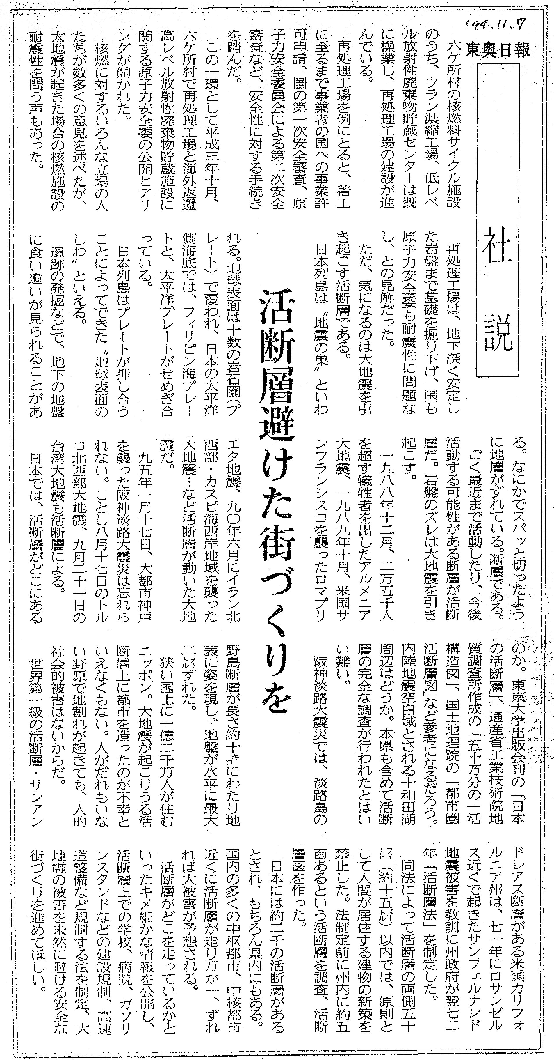 | [1999_11_07_01]社説 活断層避けた街づくりを(東奥日報1999年11月7日) |