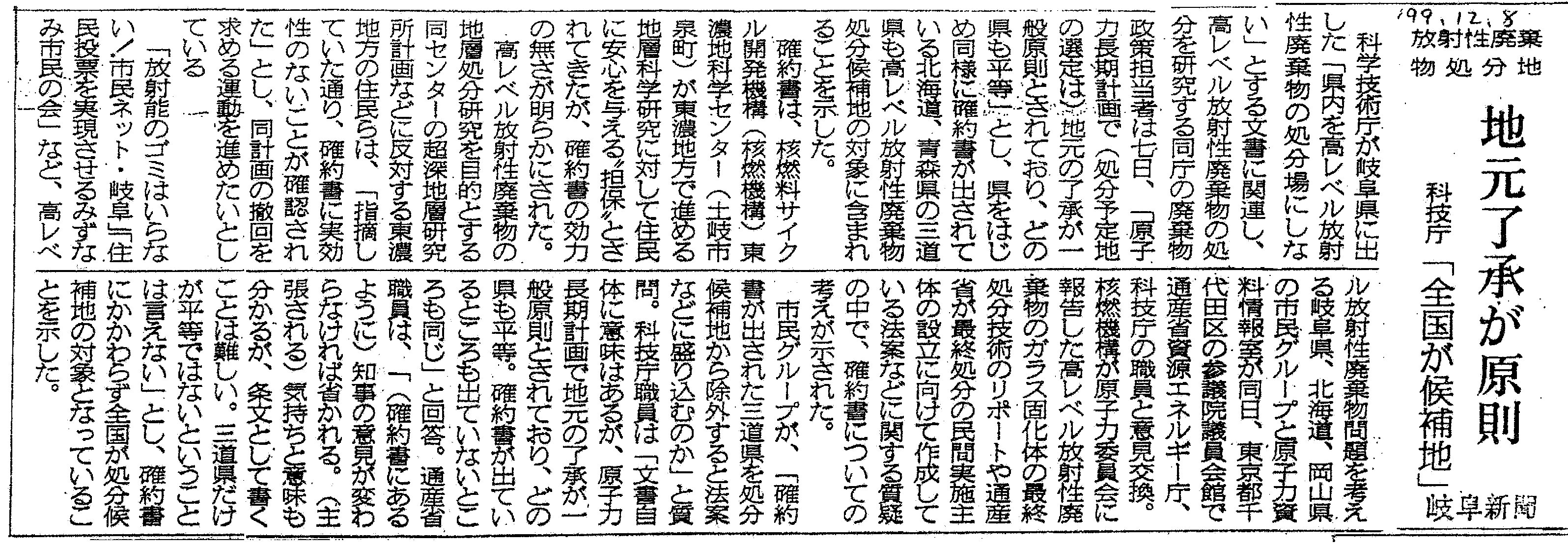[1999_12_08_01]放射性廃棄物処分地 地元了承が原則 科技庁「全国が候補地」(岐阜新聞1999年12月8日)