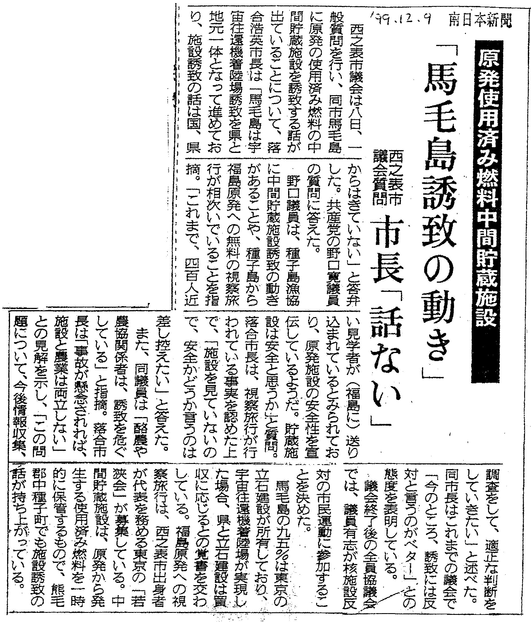 [1999_12_09_01]原発使用済み燃料中間貯蔵施設 「馬毛島誘致の動き」 西之表島市議会質問 市長「話ない」(南日本新聞1999年12月9日)