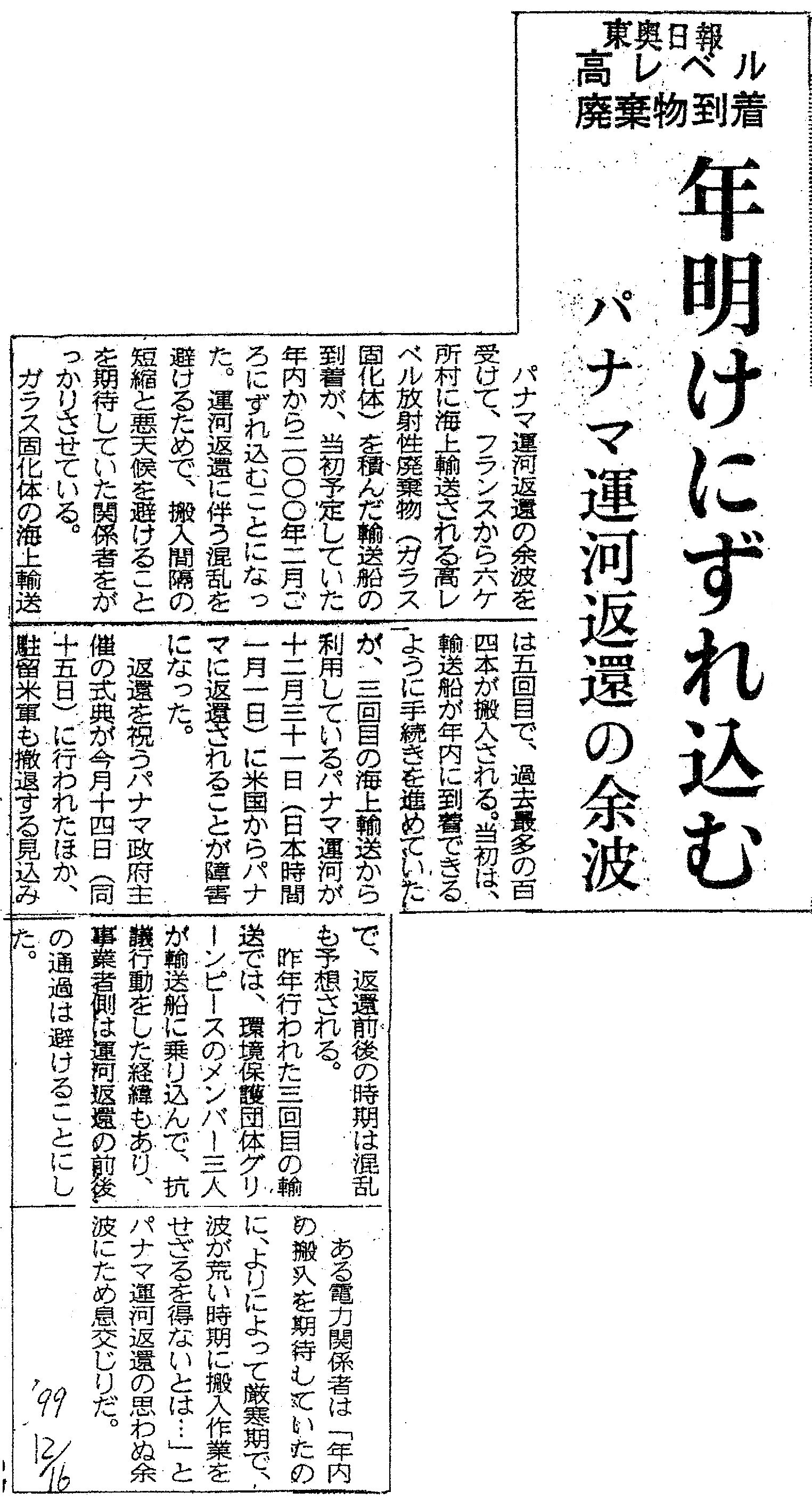 [1999_12_16_01]高レベル廃棄物到着 年明けにずれ込む パナマ運河返還の余波(東奥日報1999年12月16日)
