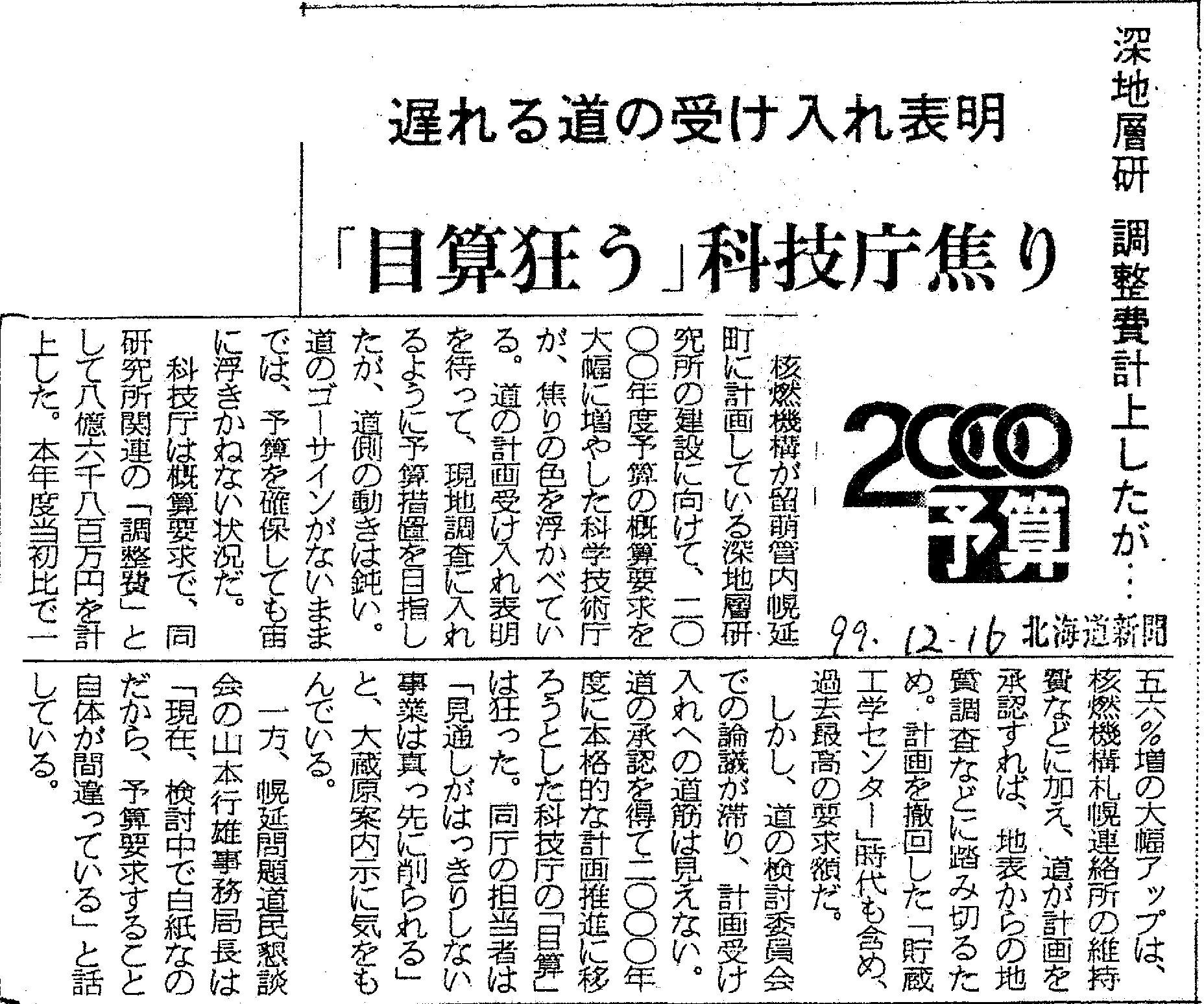 [1999_12_16_03]深地層研 調整費計上したが・・・ 遅れる道の受け入れ表明 「目算狂う」科技庁焦り 2000予算(北海道新聞1999年12月16日)