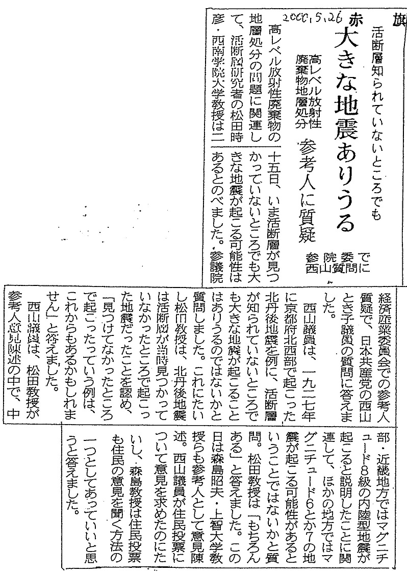 [2000_05_26_01]活断層知られていないところでも 大きな地震ありうる 高レベル放射性廃棄物地層処分 参考人に質疑 参院委で西山質問に(赤旗2000年5月26日)