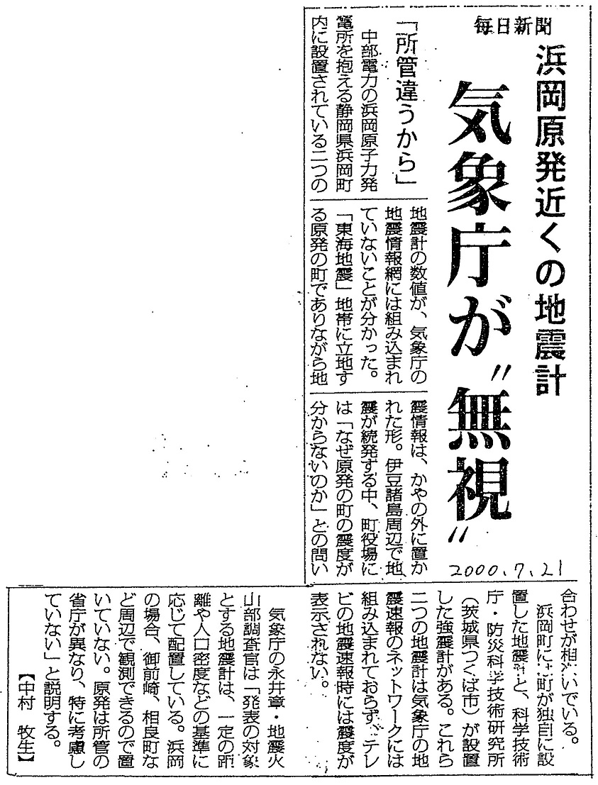 [2000_07_21_01]浜岡原発近くの地震計 気象庁が”無視” 「所管違うから」(毎日新聞2000年7月21日)
