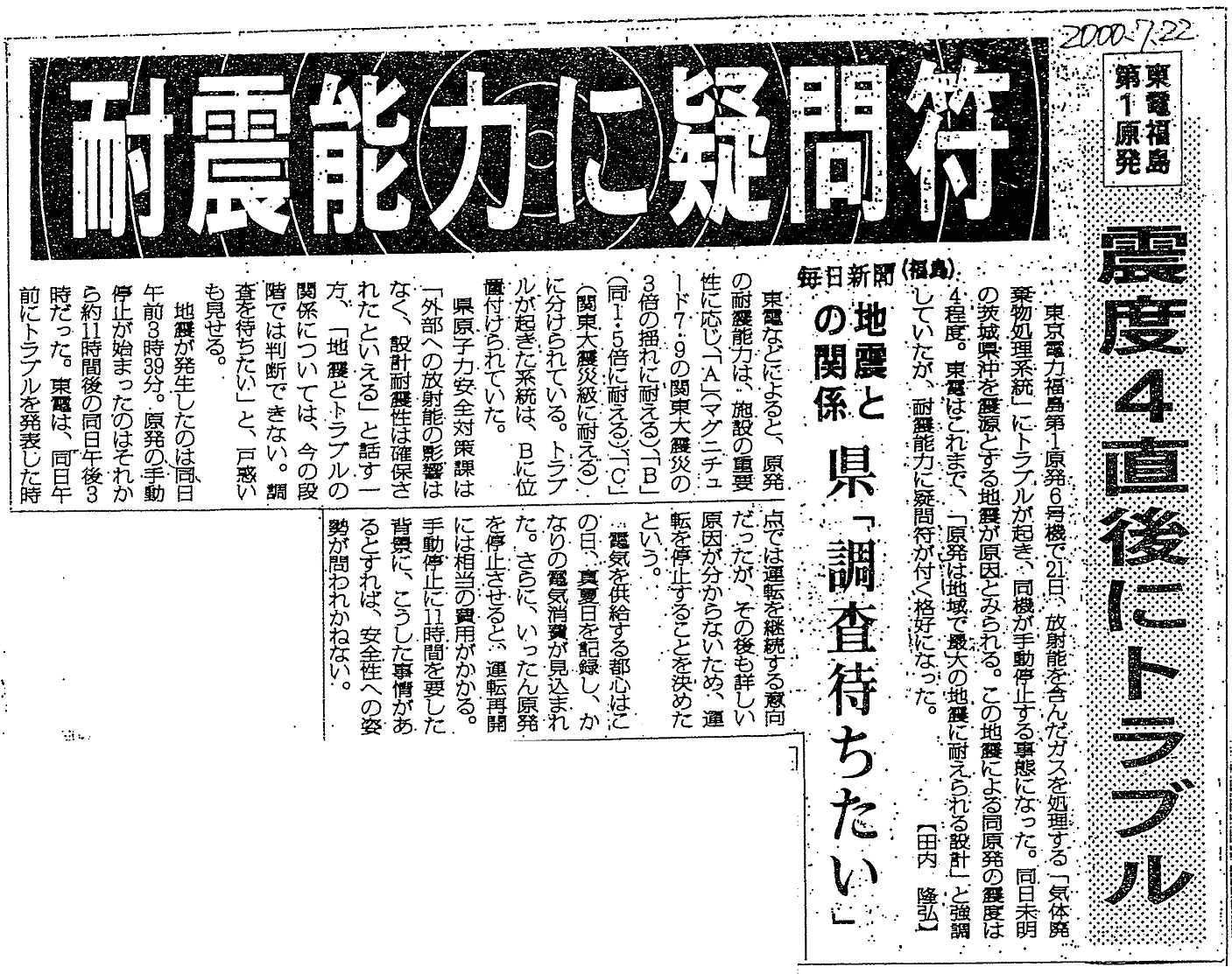 [2000_07_22_01]耐震能力に疑問符 東電福島第1原発 震度4直後にトラブル 地震との関係 県「調査待ちたい」(毎日新聞2000年7月22日)