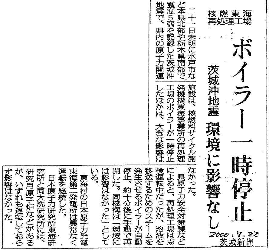 [2000_07_22_02]核燃東海再処理工場 ボイラー一時停止 茨城沖地震 環境に影響なし(茨城新聞2000年7月22日)