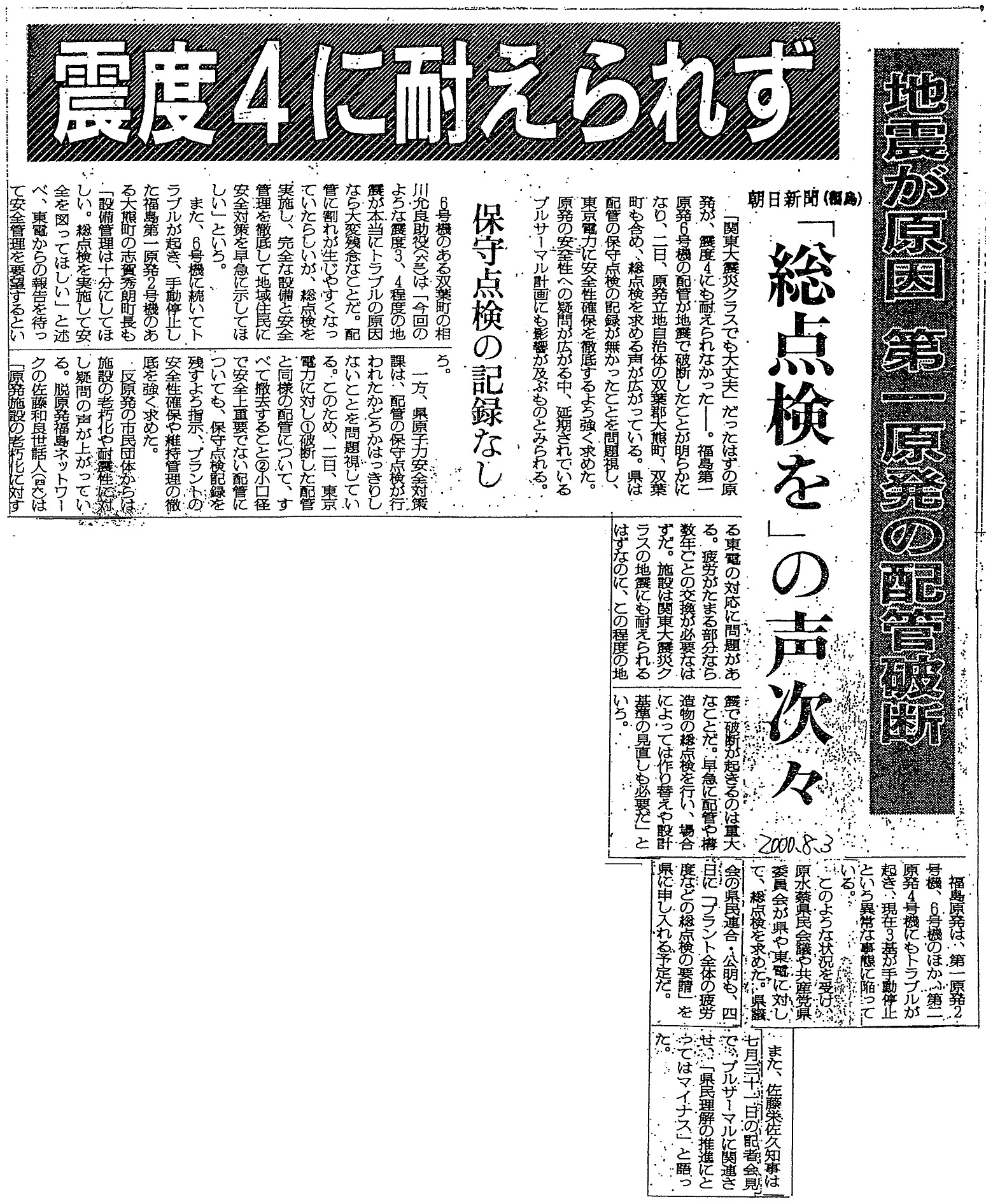 [2000_08_03_02]震度4に耐えられず 地震が原因 第一原発の配管破断 「総点検を」の声次々 保守点検の記録なし(朝日新聞2000年8月3日)