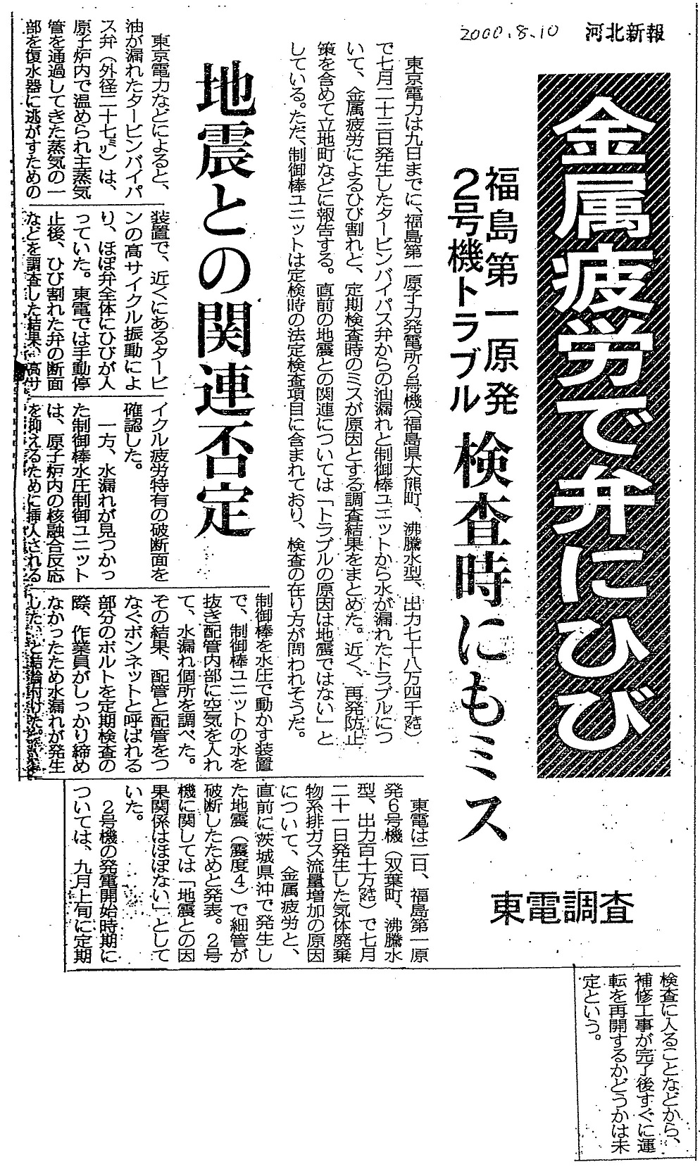 [2000_08_10_01]金属疲労で弁にひび 福島第一原発2号機トラブル 検査時にもミス 東電調査 地震との関連否定(河北新報2000年8月10日)