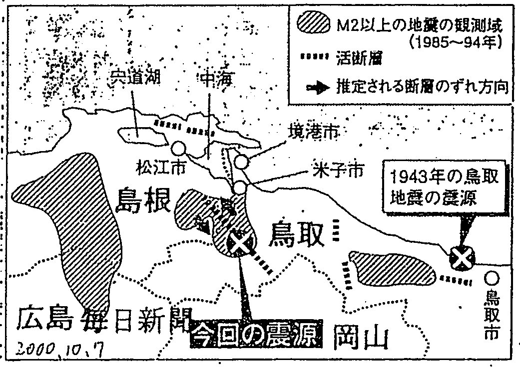 [2000_10_07_04]鳥取県西部地震 今回の震源(毎日新聞2000年10月7日)