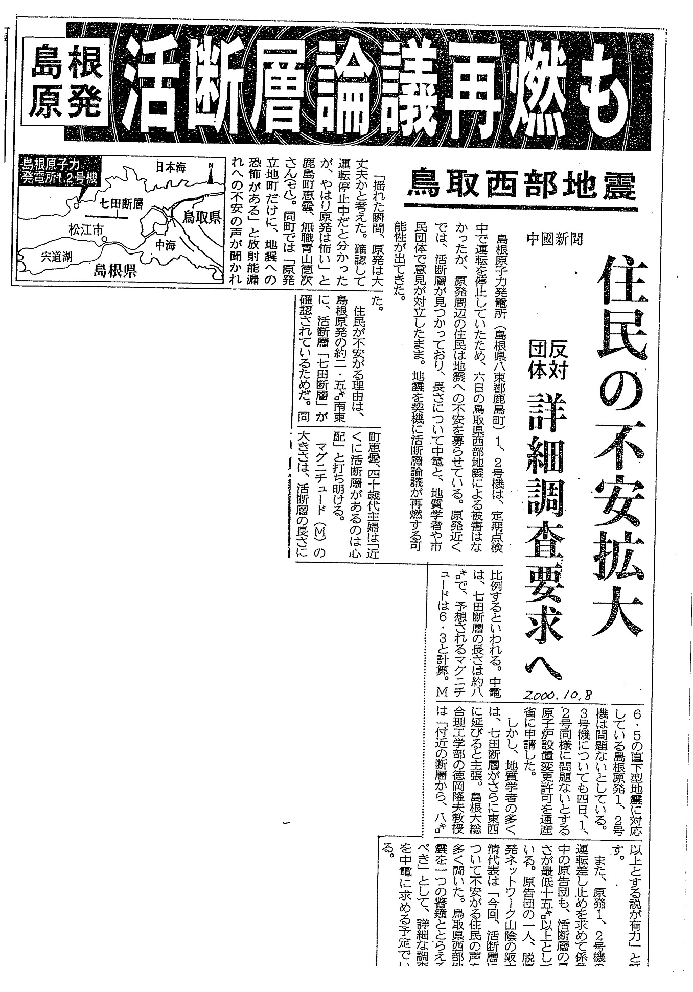 [2000_10_08_01]島根原発 活断層論議再燃も 鳥取西部地震 住民の不安拡大 反対団体 詳細調査要求へ(中国新聞2000年10月8日)