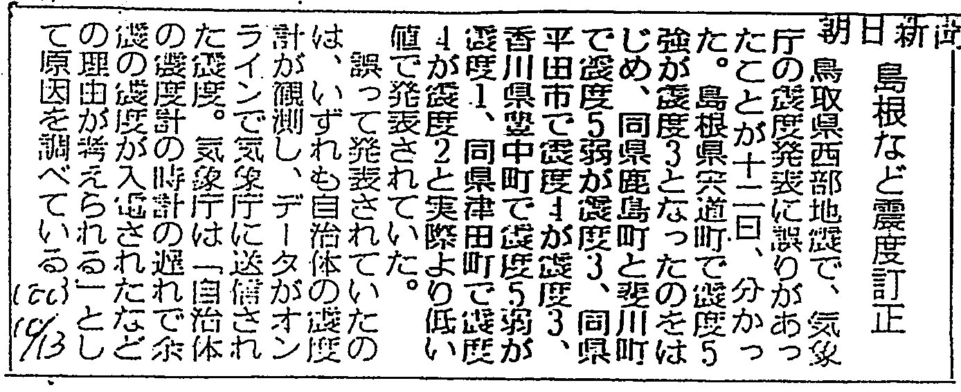 [2000_10_13_01]島根など震度訂正(朝日新聞2000年10月13日)