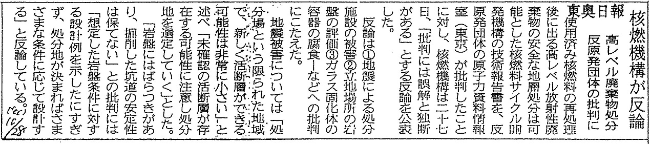 [2000_10_28_01]核燃機構が反論 高レベル廃棄物処分 反原発団体の批判に(東奥日報2000年10月28日)