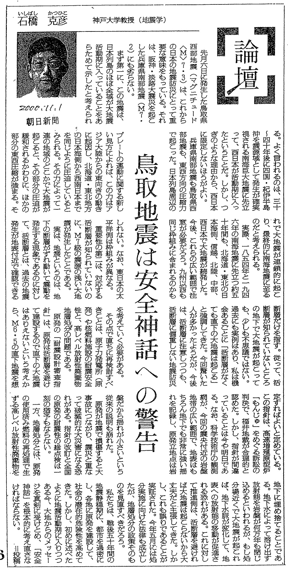 [2000_11_01_01]論壇 石橋克彦 神戸大学教授(地震学) 鳥取地震は安全神話への警告(朝日新聞2000年11月1日)