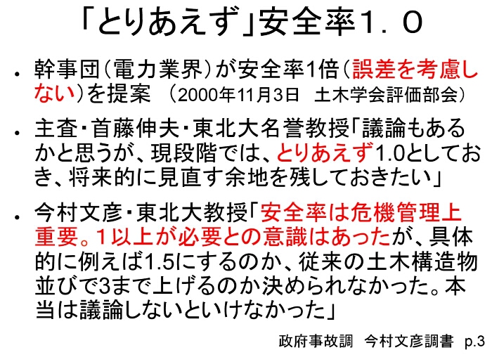・幹事団(電力業界)が安全率1倍(誤差を考慮しない)を提案(2000年11月3日 土木学会評価部会) ・主査・首藤伸夫・東北大名誉教授「議論もあるかと思うが、現段階では、とりあえず1.0としておき、将来的に見直す余地を残しておきたい」 ・今村文彦・東北大教授「安全率は危機管理上重要。1以上が必要との意識はあったが、具体的に例えば1.5にするのか、従来の土木構造物並びで3まで上げるのか決められなかった。本当は議論しないといけなかった」 政府事故調 今村文彦調書 p.3 |