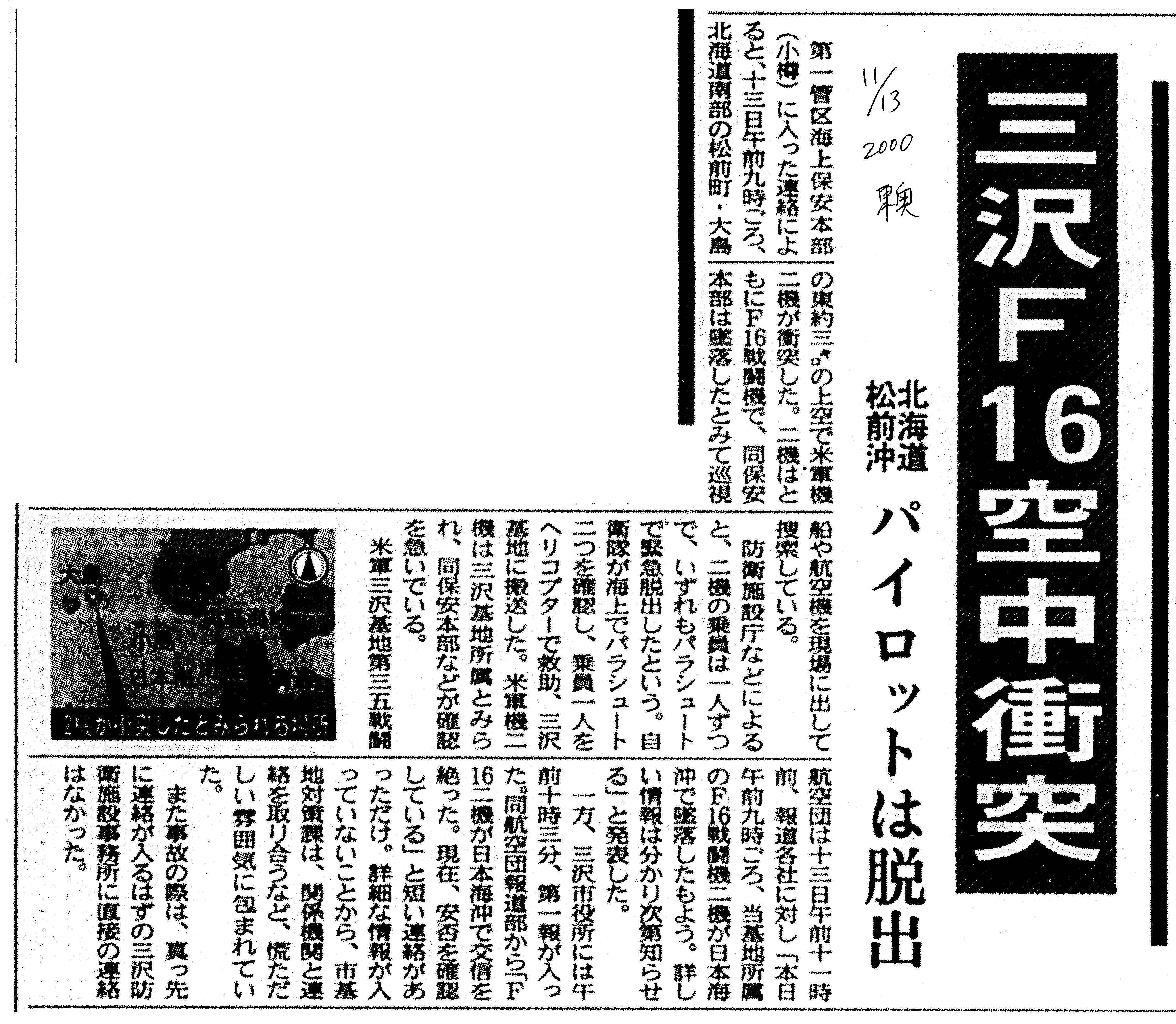 [2000_11_13_01]三沢F16空中衝突 北海道松前沖 パイロットは脱出(東奥日報2000年11月13日)