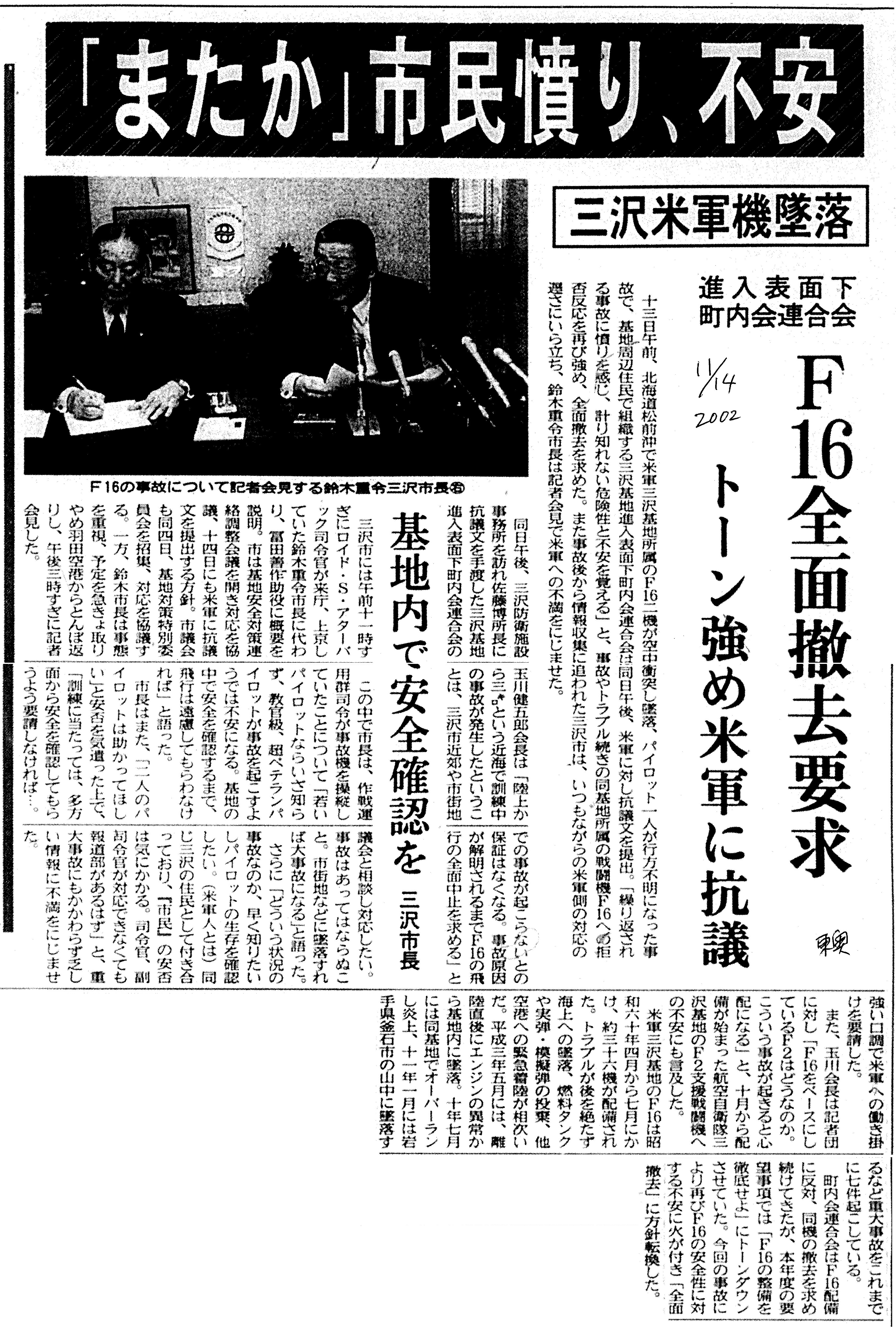 13日午前、北海道松前沖で米軍三沢基地所属のF162機が空中衝突し墜落、パイロット1人が行方不明になった事故で、基地周辺住民で組織する三沢基地進入表面下町内会連合会は同日午後、米軍に対し抗議文を提出。「繰り返される事故に憤りを感じ、計り知れない危険性と不安を覚える」と、事故やトラブル続きの同基地所属の戦闘機F16への拒否反応を再び強め、全面撤去を求めた。また事故後から情報収集に追われた三沢市は、いつもながらの米軍側の対応の遅さにいら立ち、鈴木重令市長は記者会見で米軍への不満をにじませた。 |
