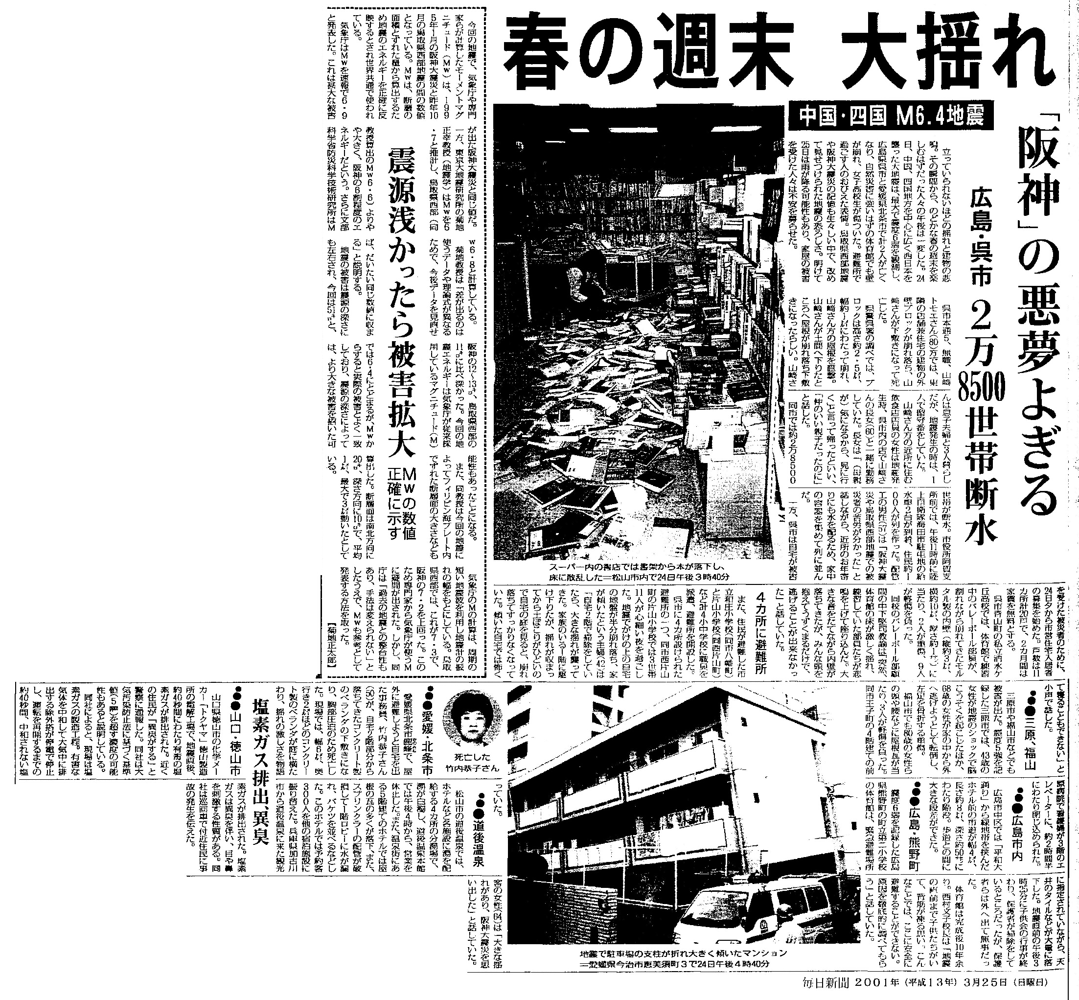 | [2001_03_25_01]春の週末 大揺れ 中国・四国M6.4地震 「阪神」の悪夢よぎる 広島・呉市 2万8500世帯断水 震源浅かったら被害拡大 Mwの数値正確に示す 4カ所に避難所 三原、福山 広島市内 広島・熊野町 愛媛・北条市 道後温泉 塩素ガス排出、異臭 山口・徳山市(毎日新聞2001年3月25日) |