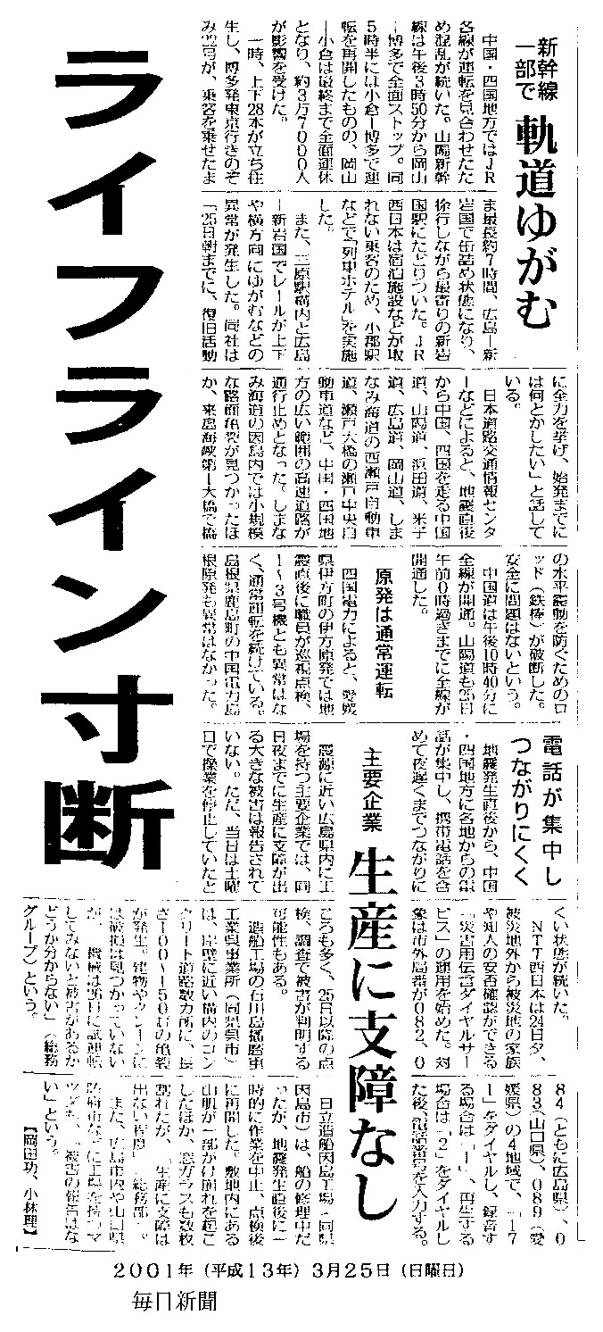 [2001_03_25_02]ライフライン寸断 新幹線一部で 軌道ゆがむ 原発は通常運転 電話が集中しつながりにくく 主要企業 生産に支障なし(毎日新聞2001年3月25日)