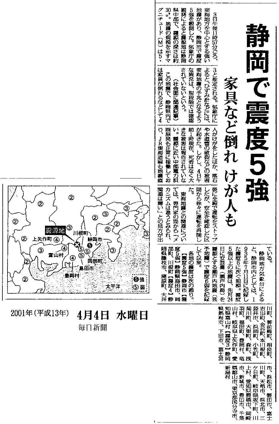 [2001_04_04_02]静岡で震度5強 家具など倒れ けが人も(毎日新聞2001年4月4日)