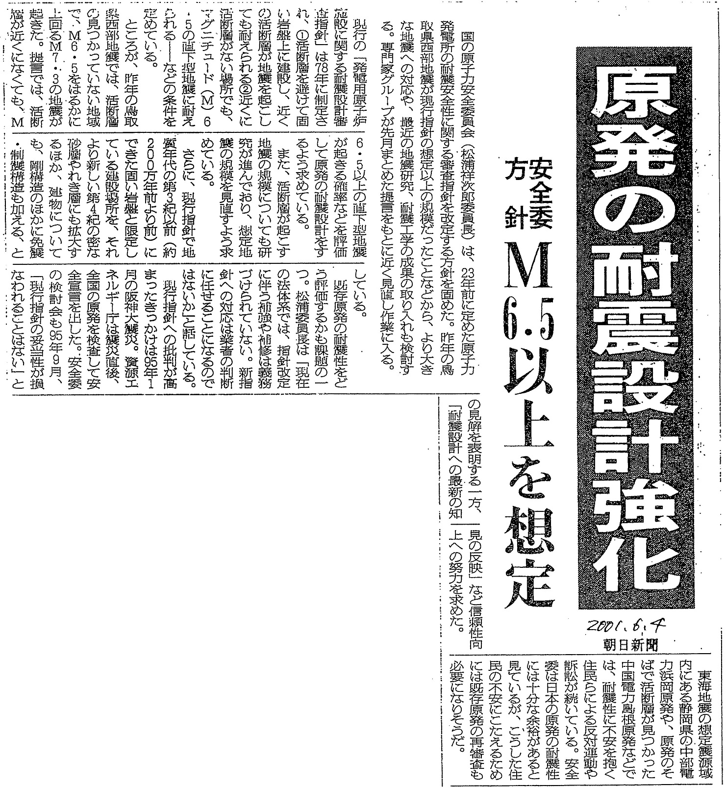 [2001_06_04_01]原発の耐震設計強化 安全委方針 M6.5以上を想定(朝日新聞2001年6月4日)