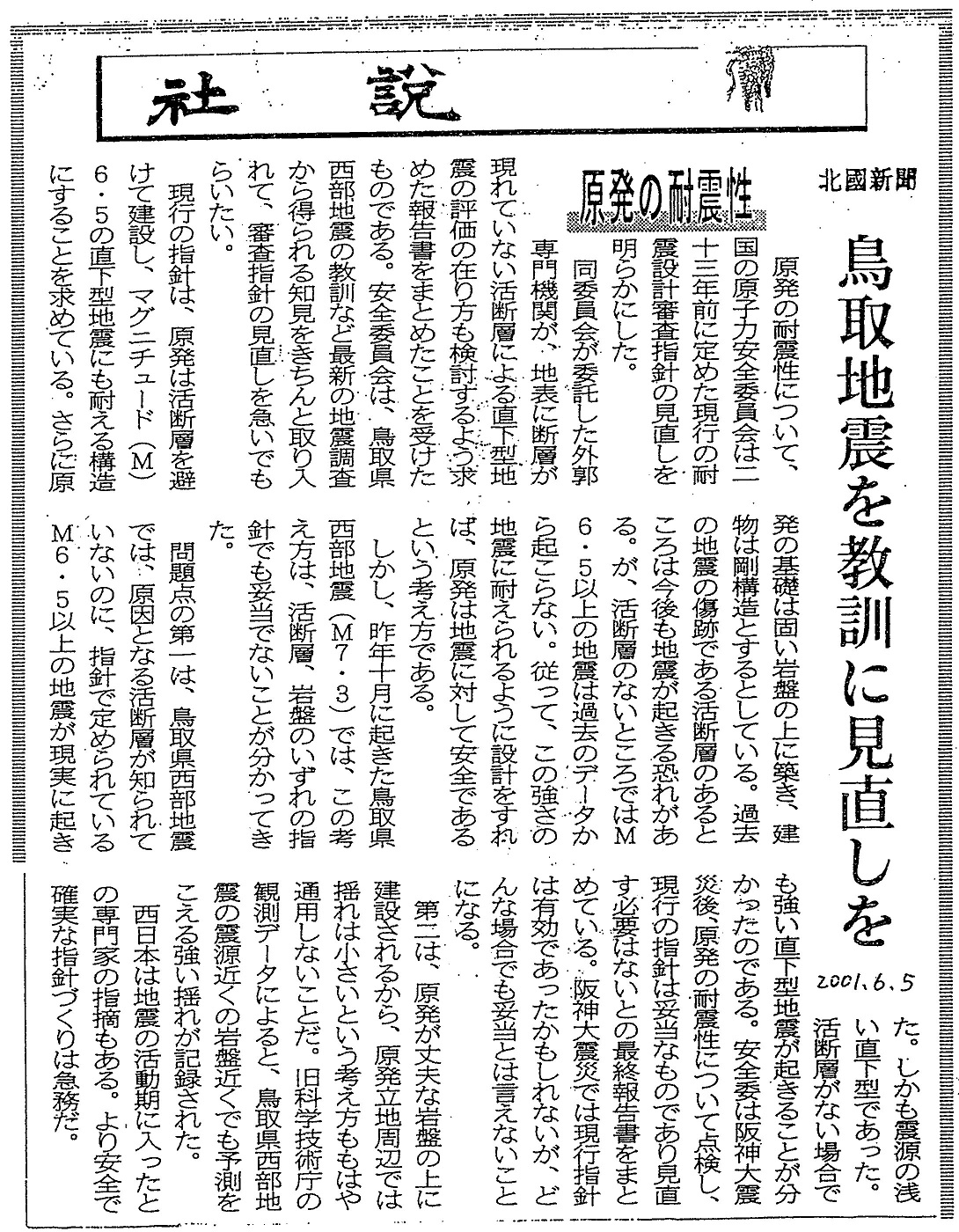[2001_06_05_01]社説 原発の耐震性 鳥取地震を教訓に見直しを(北国新聞2001年6月5日)