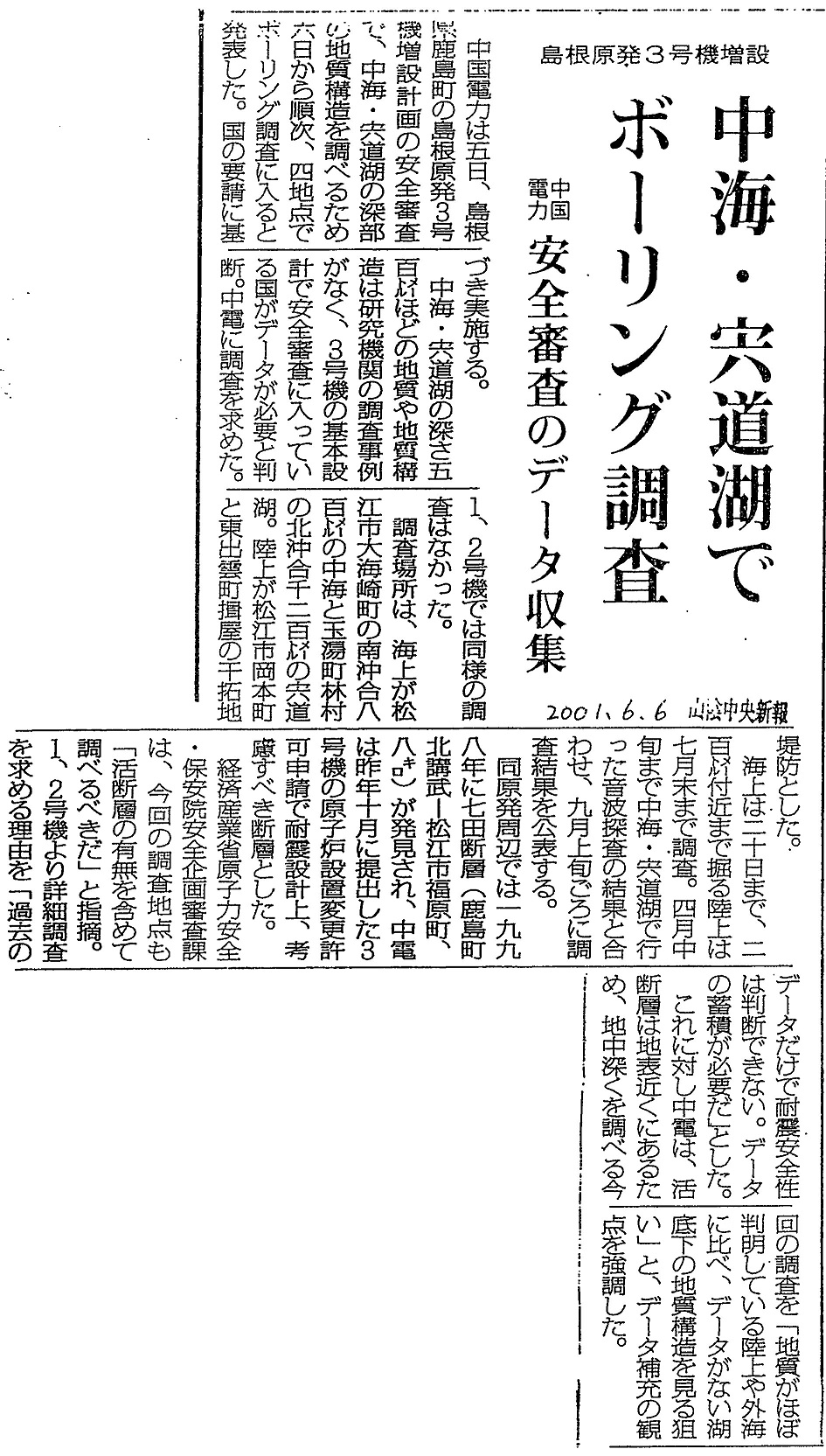 [2001_06_06_03]島根原発3号機増設 中海・宍道湖でボーリング調査 中国電力 安全審査のデータ収集(山陰中央新報2001年6月6日)