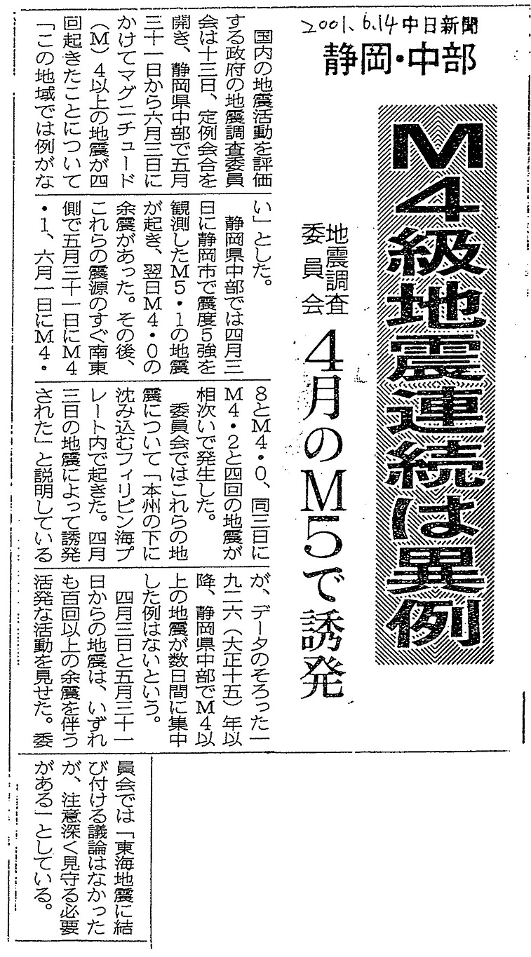 [2001_06_14_01]静岡・中部 M4級地震連続は異例 地震調査委員会 4月のM5で誘発(中日新聞2001年6月14日)