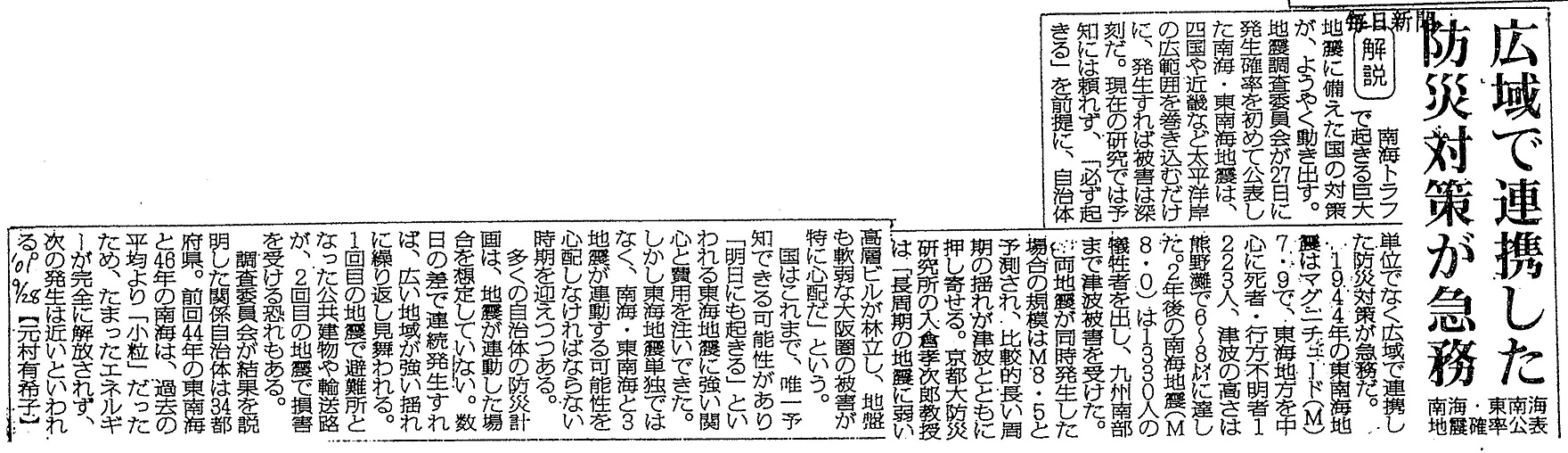 [2001_09_28_01]広域で連携した防災対策が急務 南海・東南海地震確率公表(毎日新聞2001年9月28日)