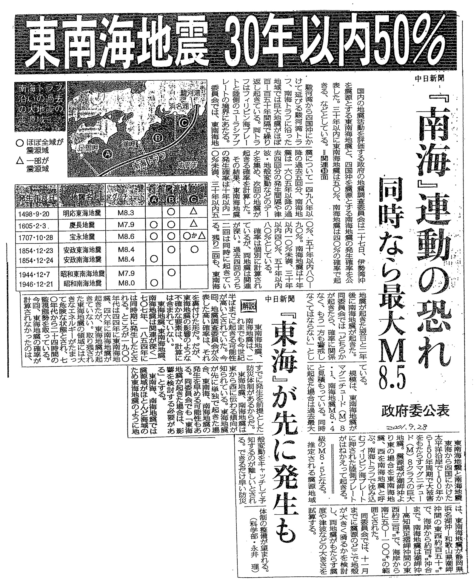 [2001_09_28_03]東南海地震 30年以内50% 『南海』連動の恐れ 同時なら最大M8.5 政府委公表 『東海』が先に発生も(中日新聞2001年9月28日)