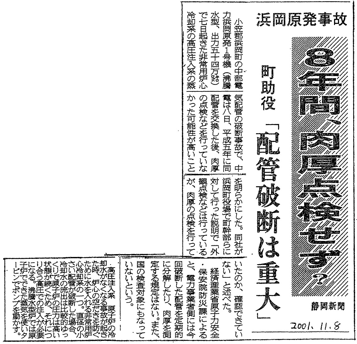 [2001_11_08_01]浜岡原発事故 8年間、肉厚点検せず? 町助役 「配管破断は重大」(静岡新聞2001年11月8日)