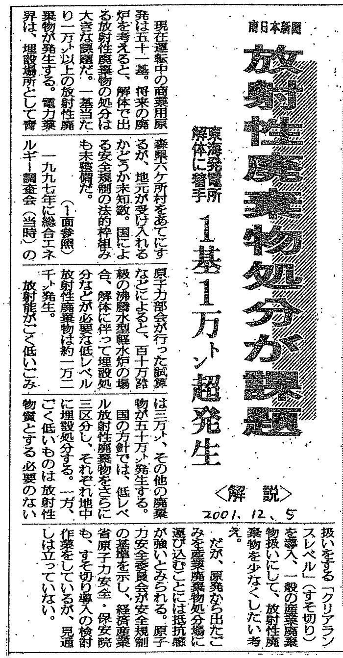 [2001_12_05_02]放射性廃棄物処分が課題 東海発電所解体に着手 1基1万トン超発生(南日本新聞2001年12月5日)