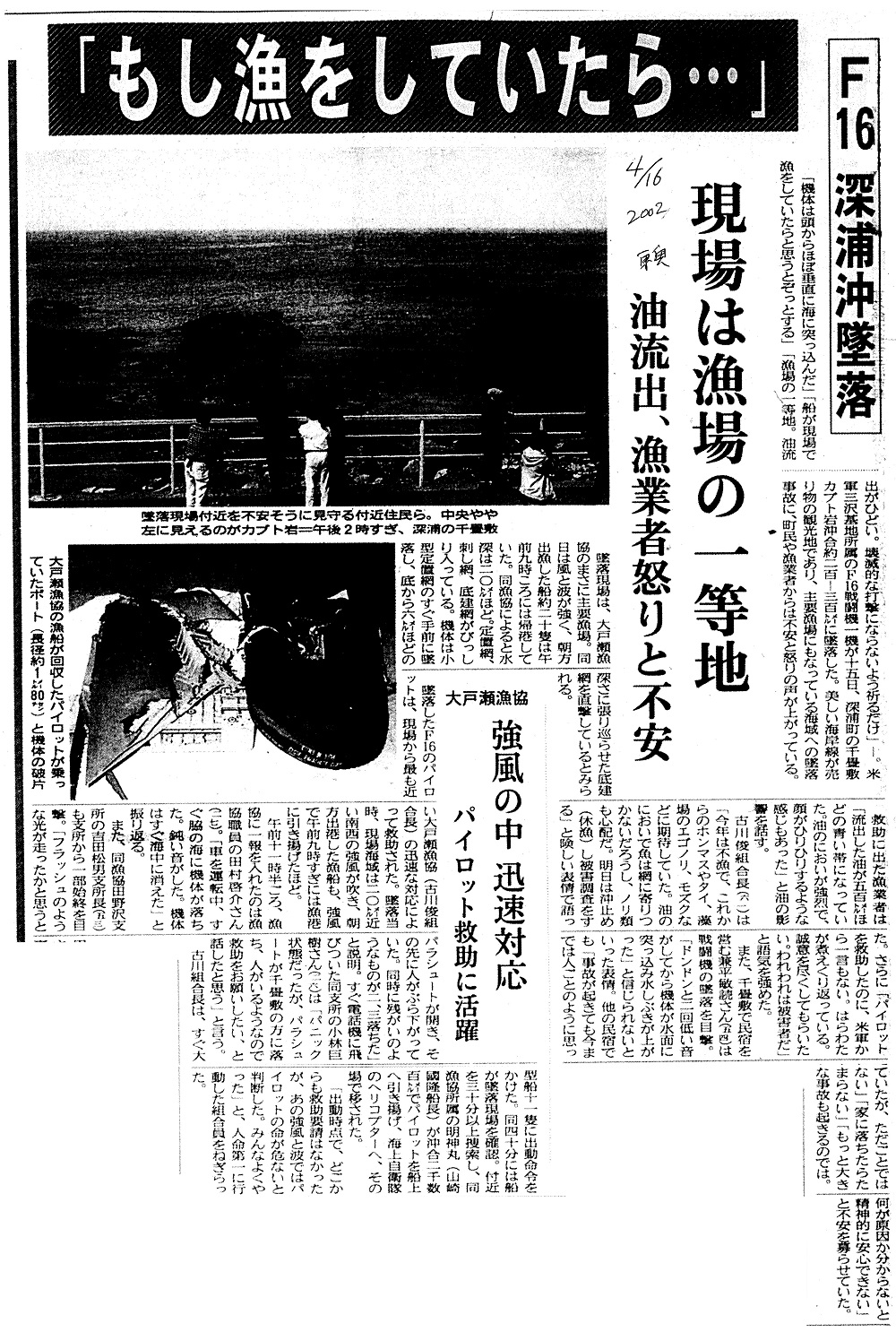 | [2002_04_16_01]「もし漁をしていたら・・・」 F16深浦沖墜落 現場は漁場の一等地 油流出、漁業者怒りと不安 大戸瀬漁協 強風の中 迅速対応 パイロット救助に活躍(東奥日報2002年4月16日) |