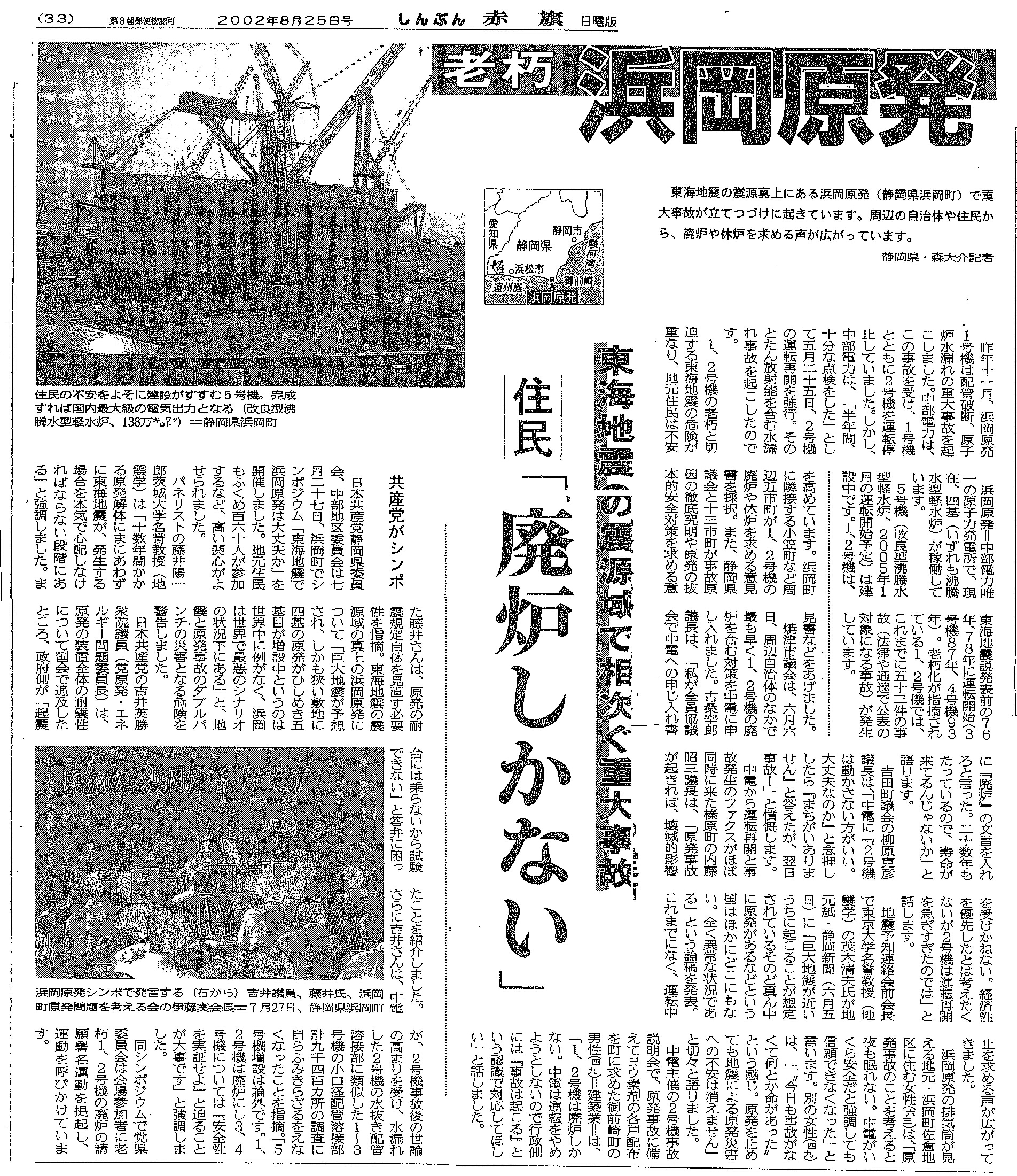 [2002_08_25_01]老朽 浜岡原発 東海地震の震源域で相次ぐ重大事故 住民「廃炉しかない」(赤旗2002年8月25日)