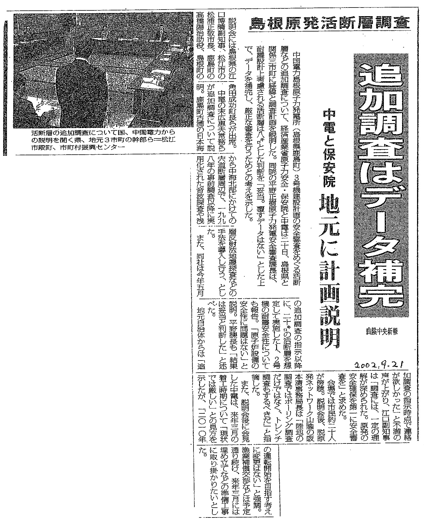 [2002_09_21_01]島根原発活断層調査 追加調査はデータ補完 中電と保安院 地元に計画説明(山陰中央新報2002年9月21日)