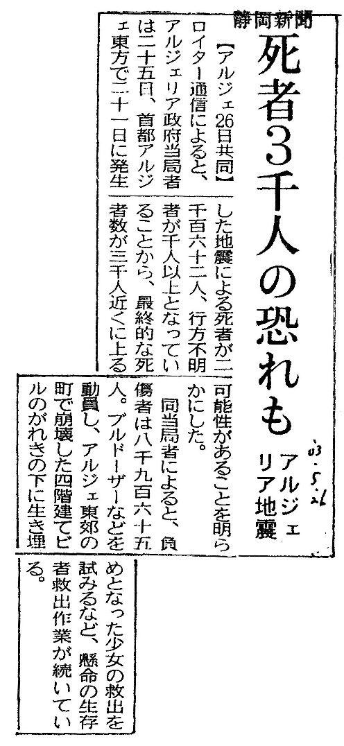 [2003_05_26_01]死者3千人の恐れも アルジェリア地震(静岡新聞2003年5月26日)