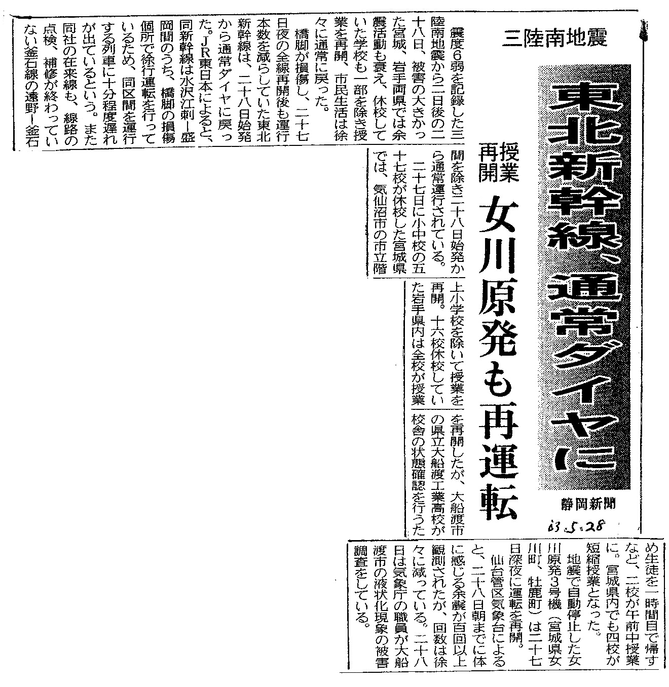 [2003_05_28_02]三陸南地震 東北新幹線、通常ダイヤに 授業再開 女川原発も再運転(静岡新聞2003年5月28日)