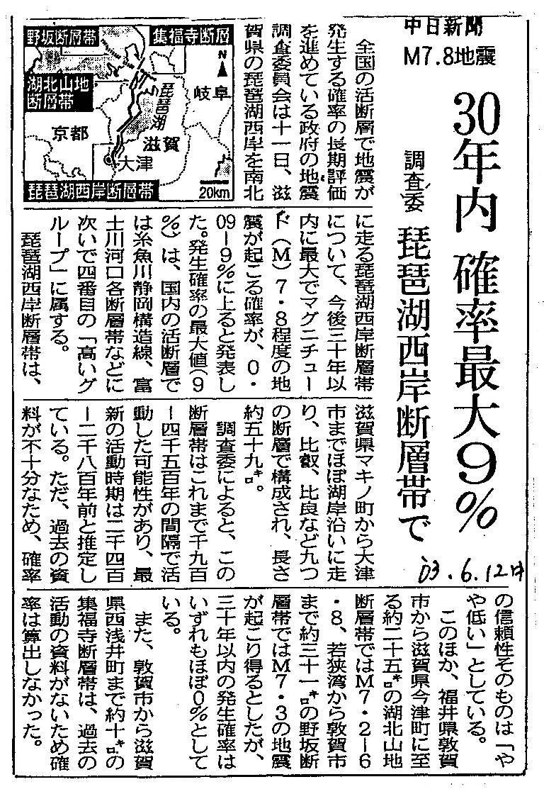 [2003_06_12_01]M7.8地震 30年内 確率最大9% 調査委 琵琶湖西岸断層帯で(中日新聞2003年6月12日)