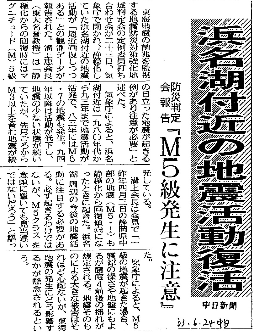 [2003_06_24_01]浜名湖付近の地震活動復活 防災判定会報告 『M5級発生に注意』(中日新聞2003年6月24日)