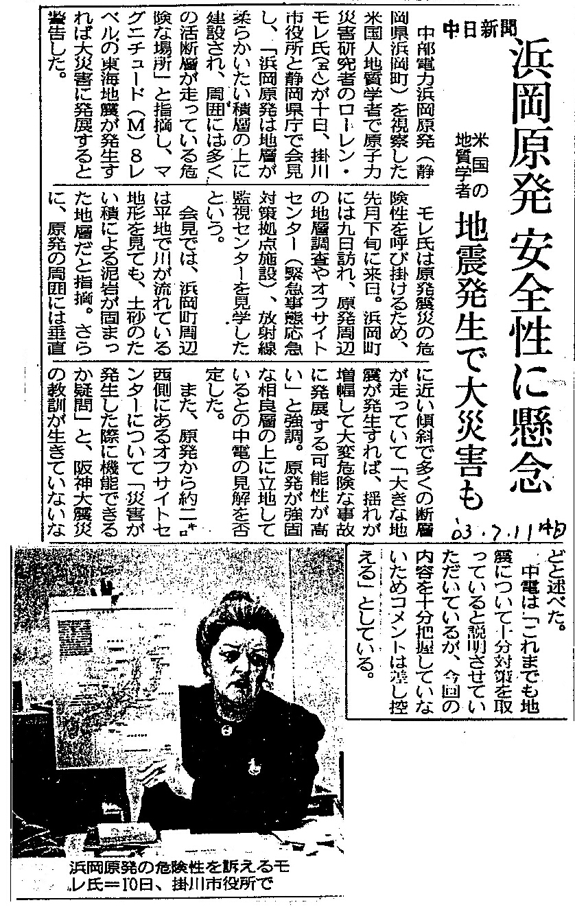 [2003_07_11_01]浜岡原発 安全性に懸念 米国の地質学者 地震発生で大災害も(中日新聞2003年7月11日)