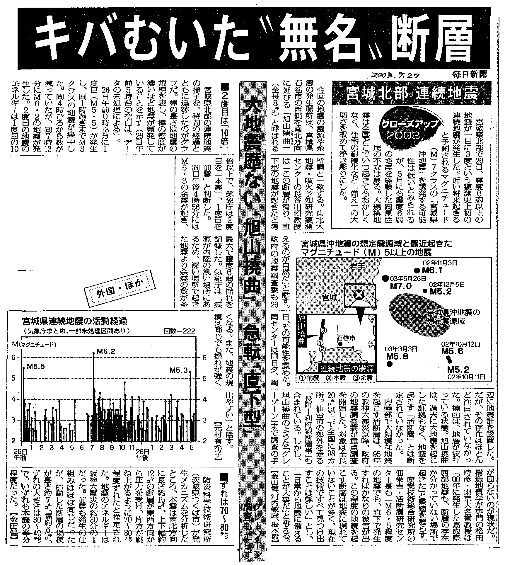 | [2003_07_27_01]キバむいた”無名”断層 宮城北部 連続地震 大地震歴ない「旭山撓曲」 急転「直下型」 グレーゾーン調査も至らず 2度目は「10倍」 ずれは70〜80センチ(毎日新聞2003年7月27日) |