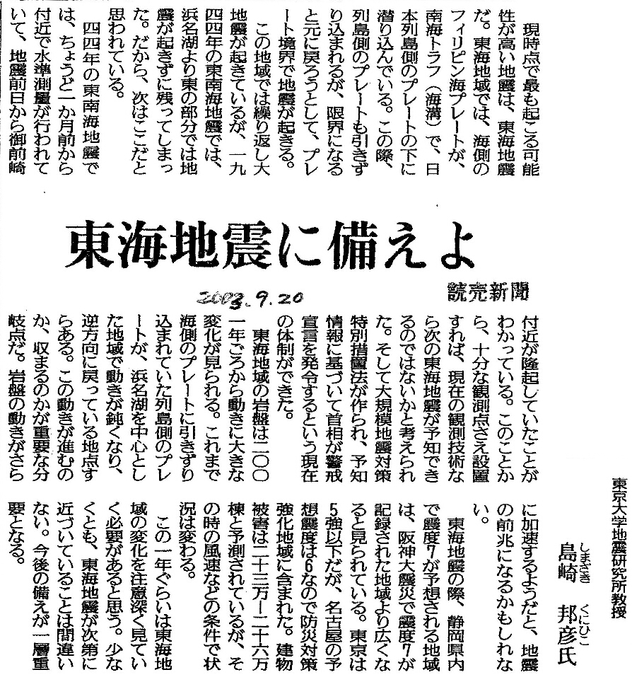 | [2003_09_20_01]東海地震に備えよ 東京大学地震研究所教授 島崎邦彦氏(読売新聞2003年9月20日) |