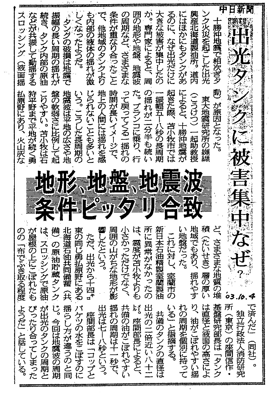 [2003_10_04_01]出光タンクに被害集中なぜ? 地形、地盤、地震波 条件ピッタリ合致(中日新聞2003年10月4日)