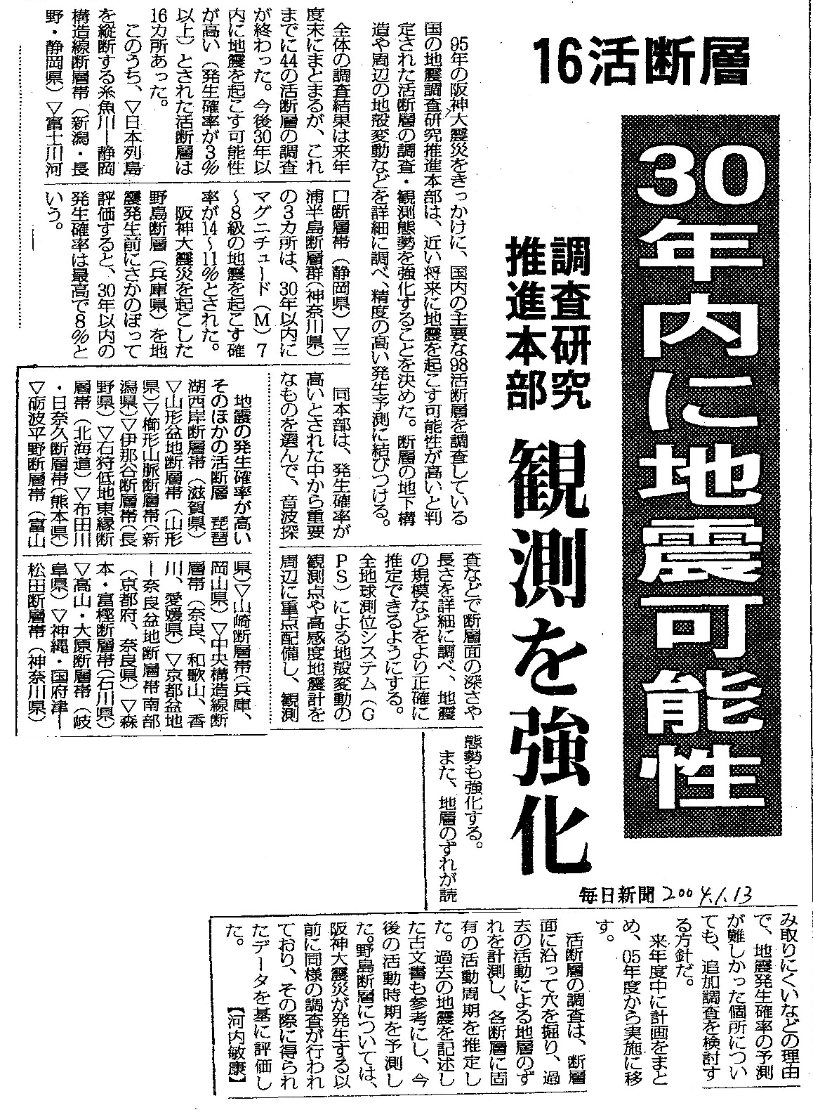 | [2004_01_13_01]16活断層 30年以内に地震可能性 調査研究推進本部 観測を強化(毎日新聞2004年1月13日) |